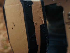 We completely covered our Reduced C Zone Steel target plate with cardboard on all sides. In order to answer the question: ‘Do Bullets Ricochet Off Steel Targets?’, we need a way to track where the fragmentation is going. By completely covering and surrounding the target plate with cardboard, we are effectively creating a medium that can track this fragmentation. We picked several common calibers to showcase the results. Although we did not exclusively test ALL available calibers on the market (that would be unrealistic), all calibers with proper ammo will display the same results.